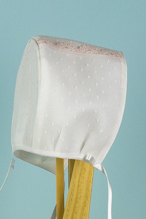 Gorro 430 fabricado en tul bordado color blanco roto lazos de raso color blanco roto y encaje color rosa.