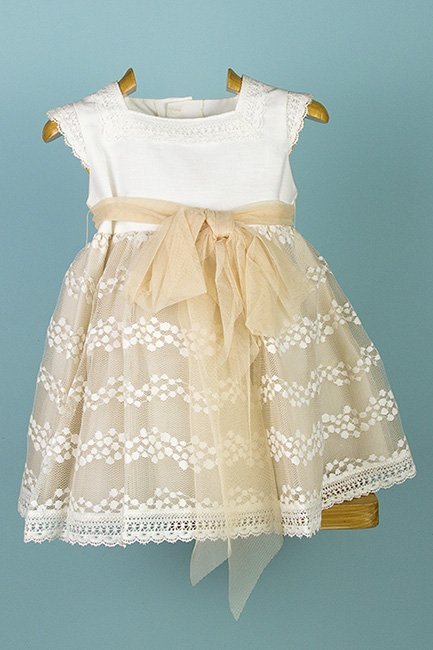 Vestido niña 365 fabricado en tul bordado color blanco roto y cinturón y forro camel. Manga cortita y cuello cuadrado.