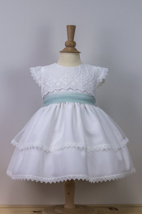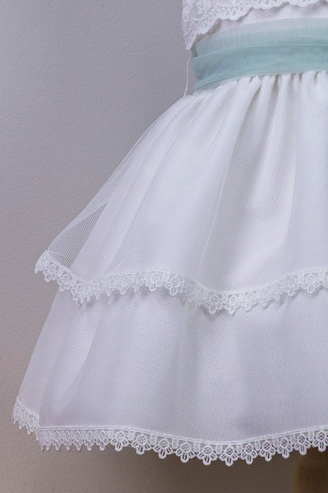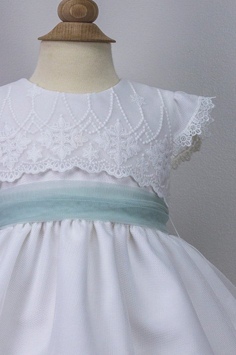Vestido niña 467 fabricado en tul bordado blanco roto con cinturón verde. Manga sisa y cuello redondo.